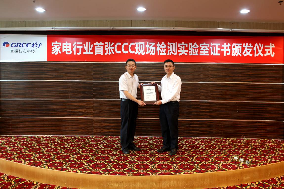 5月13日,珠海格力電器股份有限公司獲得中國質(zhì)量認證中心(CQC)頒發(fā)的家電行業(yè)首張CCC現(xiàn)場檢測實驗室證書。中國質(zhì)量認證中心副主任劉彥賓、格力電器副總裁黃輝出席證書授予儀式。
