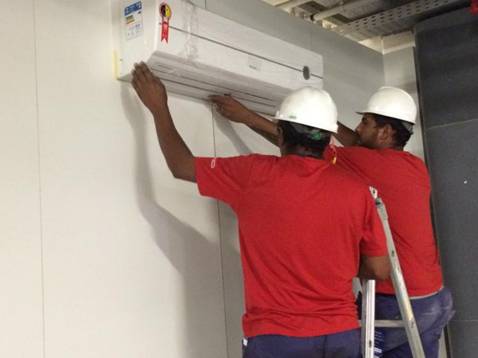圖為巴西工人在場館內(nèi)安裝調(diào)試格力空調(diào)