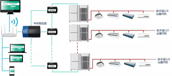 網(wǎng)絡集中控制系統(tǒng),可組群控制,帶分戶計費功能,單個集控可連接1024臺內(nèi)機,可多個集控組合,最多可以連接8×1024=8192臺室內(nèi)機。